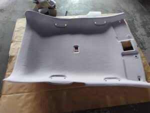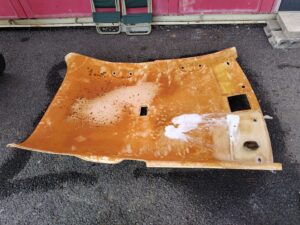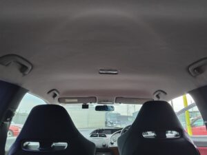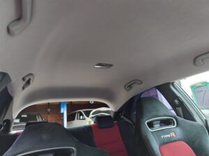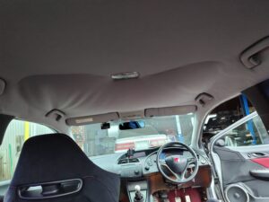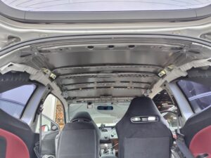 ピラーなど干渉いたします部品を外しまして、天井ライナーを車外から取り出します。